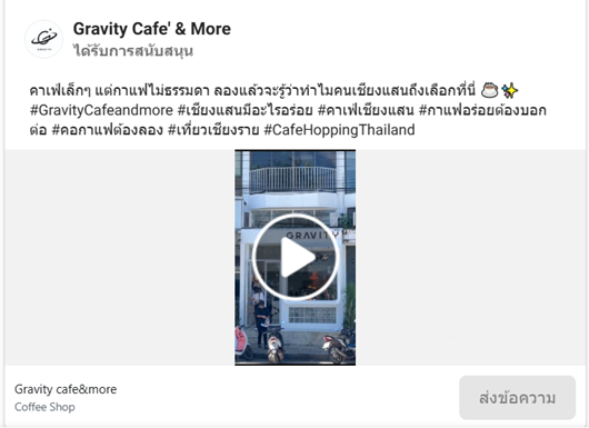 Ads ของร้านนี้ เขียน caption สั้นๆ น่าสนใจ มี hashtag หลากหลาย ทำคลิปดึงจุดเด่นของร้านออกมาได้ดี มีช่องทางส่งข้อความติดต่อร้านได้