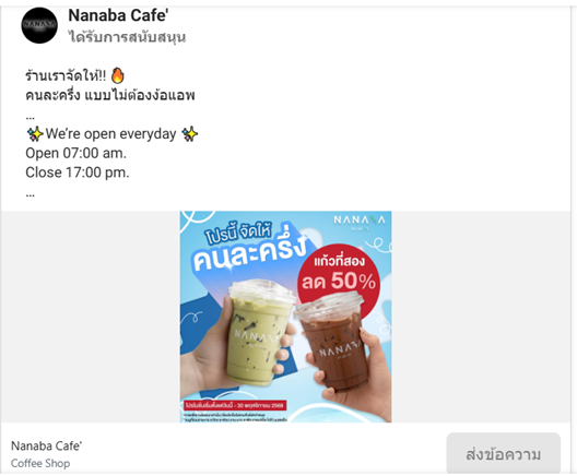 Ads ร้านนี้ โฆษณาโปรโมชั่นลดราคาสินค้า โดยอิงจากโครงการคนละครึ่งของรัฐ ซึ่งจะช่วยดึงดูดลูกค้าได้ดี มีวัน-เวลาเปิดปิดชัดเจน ทำ infographic โฆษณาได้ดี ไม่ต้องอ่านแคปชั่นละเอียด ดูผ่านๆก็น่าสนใจ มีช่องทางส่งข้อความติดต่อร้านได้